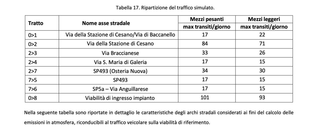 Il documento elaborato da AMA per l’approvazione del progetto con lo studio dell’inquinamento per l’aumento del traffico riporta un dato per noi molto importante: i mezzi che circolando su via di Baccanello e via della Stazione di Cesano raggiungeranno quotidianamente l’impianto saranno 17 pesanti e 22 leggeri. Mentre tra la via Braccianese Clodia e l’impianto lungo l’altro tratto di via della Stazione di Cesano passeranno 84 pesanti e 71 leggeri.*