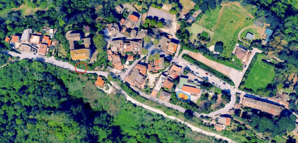 Il borgo di Isola Farnese dal satellite di Google Earth: il cerchio indica il punto dei crolli