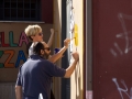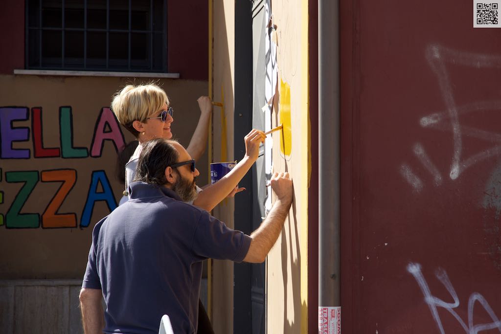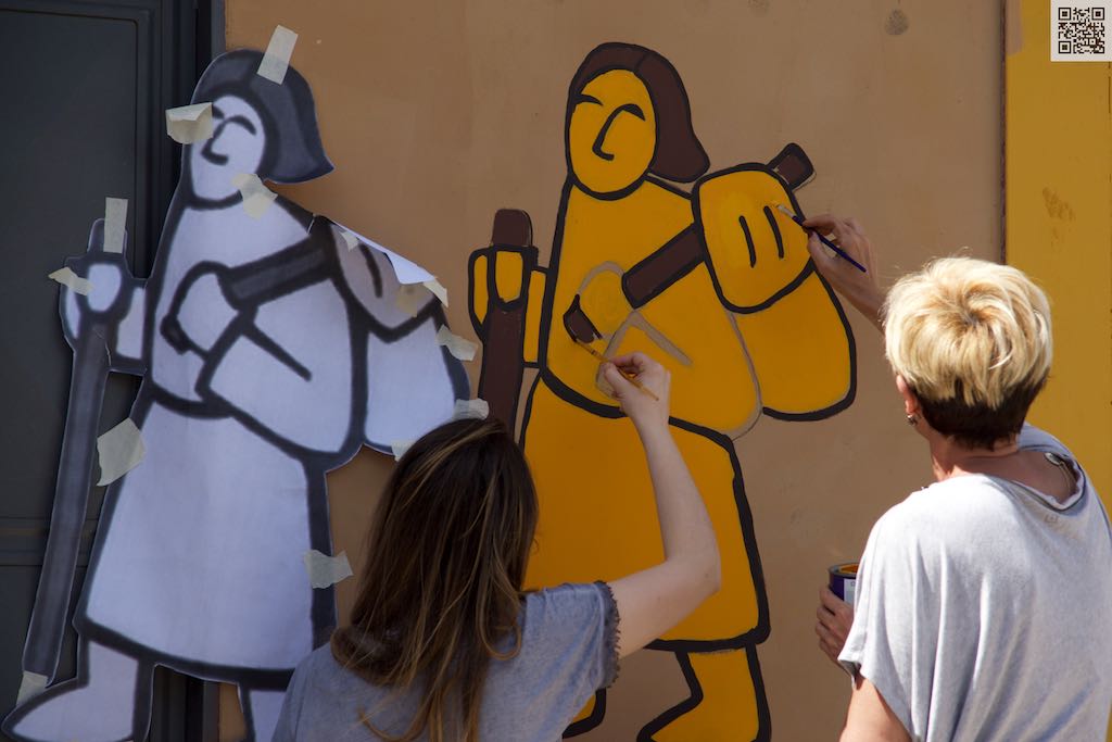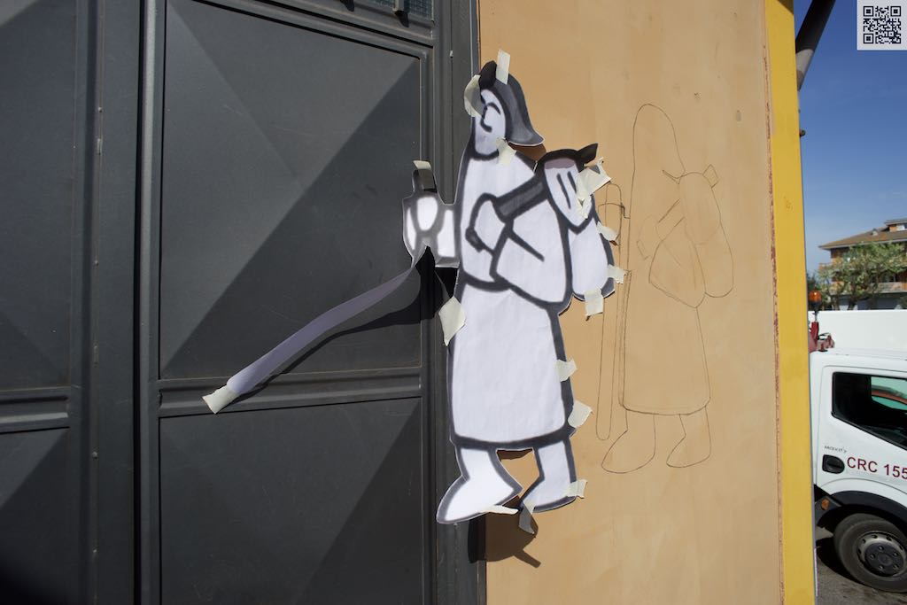 Questa mattina si è completato il murales del “Muro della Gentilezza”  (il Dazio) a La Storta, con il disegno di due pellegrini e le indicazioni dei sensi di marcia verso Roma e Viterbo.